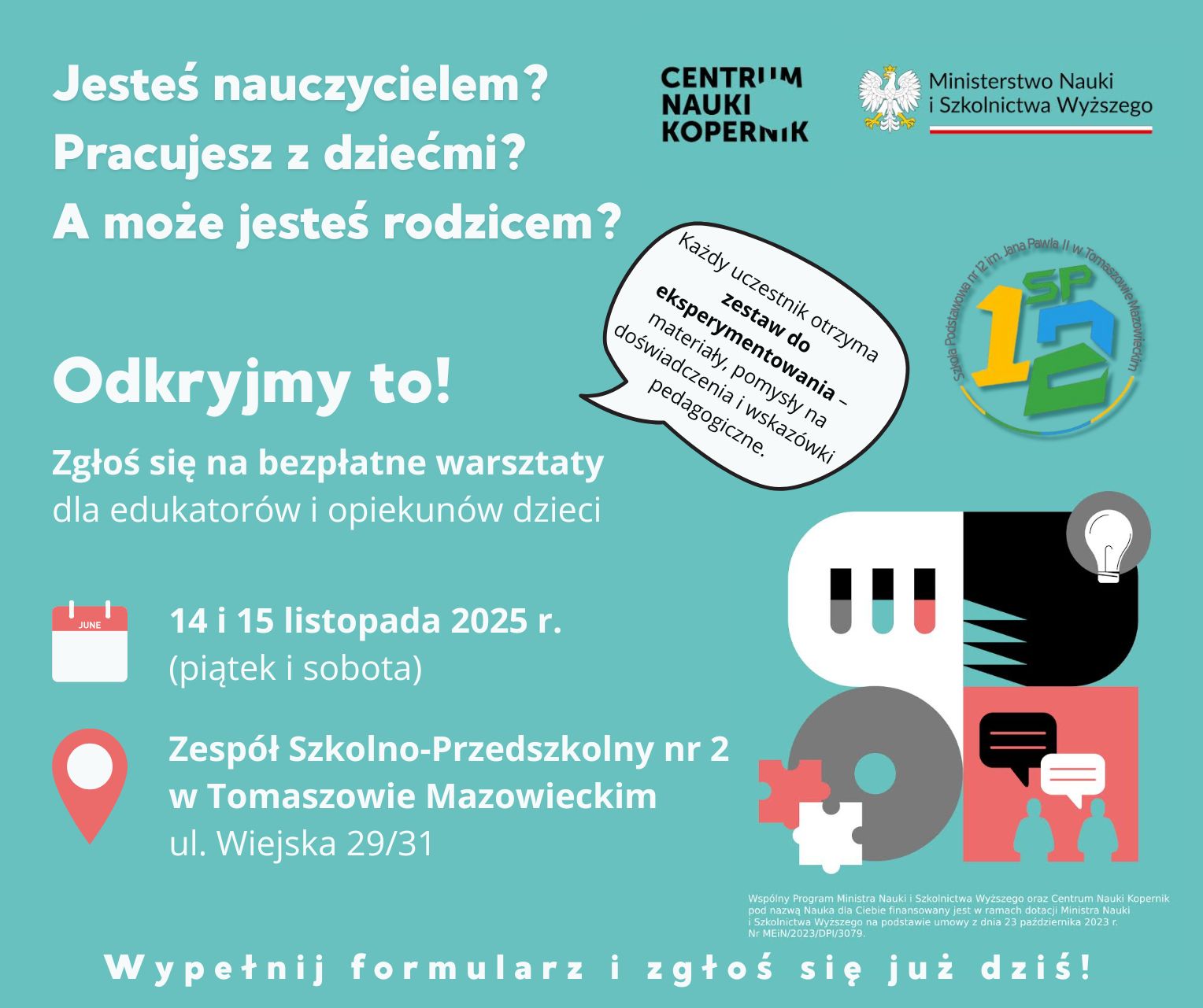 Z radością informujemy, że 14 i 15 listopada (piątek i sobota) w naszej placówce odbędą się warsztaty o wspierającym towarzyszeniu dzieciom podczas eksperymentowania. Program „Odkryjmy to!” powstał ze wspólnej inicjatywy Centrum Nauki Kopernik oraz Ministra Nauki i Szkolnictwa Wyższego. Warsztaty są bezpłatne! Zapraszamy edukatorów (osoby pracujące z dziećmi) oraz rodziców dzieci w wieku szkolnym.