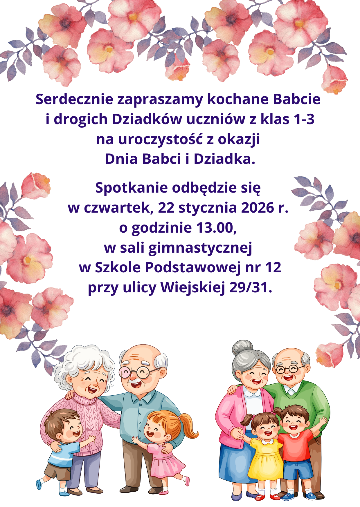 Serdecznie zapraszamy kochane Babcie i drogich Dziadków uczniów z klas 1-3 na uroczystość z okazji Dnia Babci i Dziadka. Spotkanie odbędzie się w czwartek, 22 stycznia 2026 r. o godzinie 13.00, w sali gimnastycznej w Szkole Podstawowej nr 12 przy ulicy Wiejskiej 29/31. [.png, 1.31 MB]
