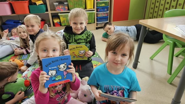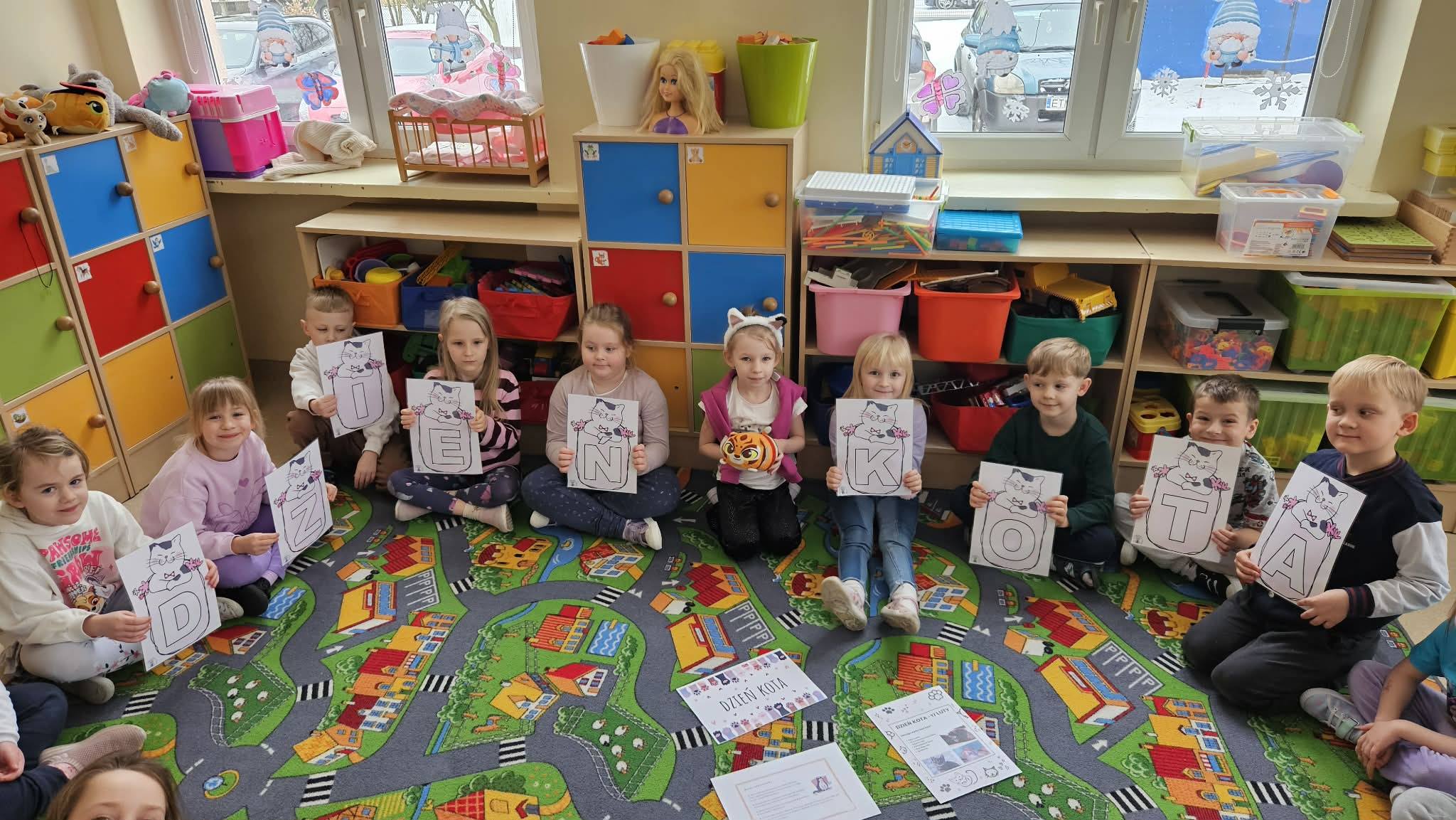 Były też „kocie zabawy” – ciche chodzenie jak kotki, tor przeszkód, gry w memory i mnóstwo czytania ulubionych książek. Na koniec dzieci wykonały piękne prace plastyczne z wizerunkiem kotów.
