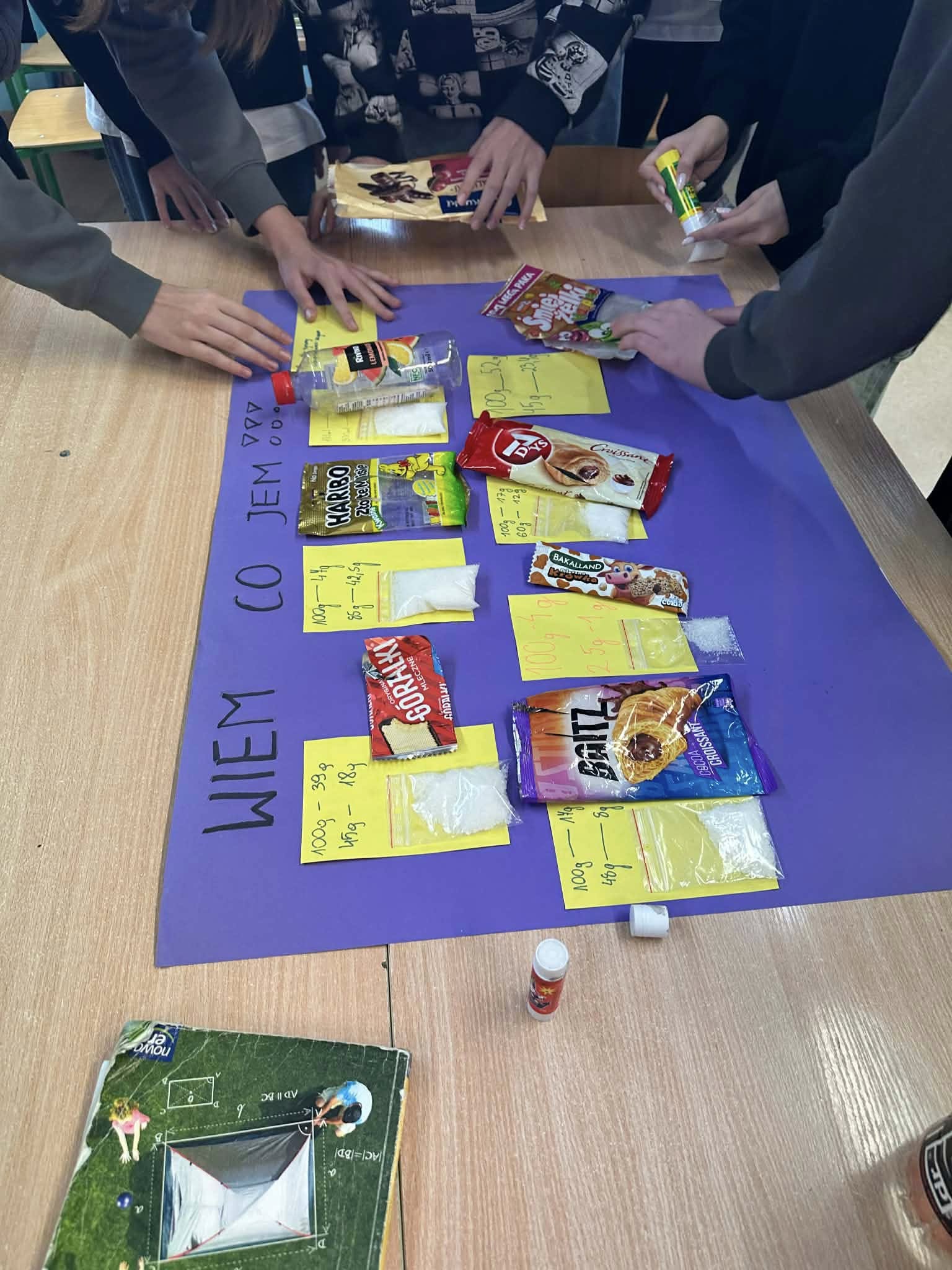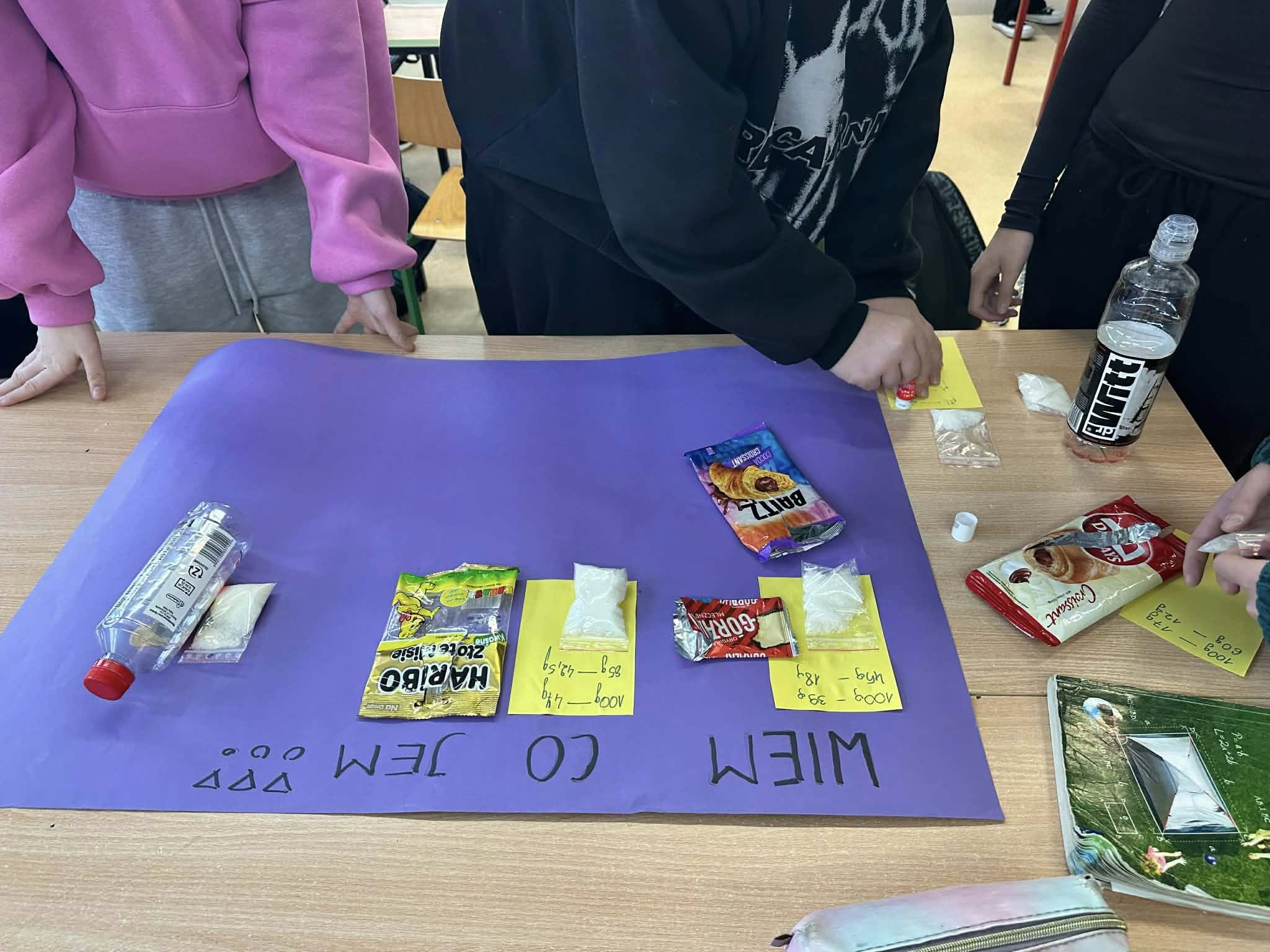 Uczniowie klasy 7b w ramach projektu „Niezwykła matematyka” zrealizowali zadanie „Wiem, co jem”, które polegało na obliczeniu, ile cukru znajduje się w popularnych przekąskach i napojach oraz na odważeniu tej ilości cukru.