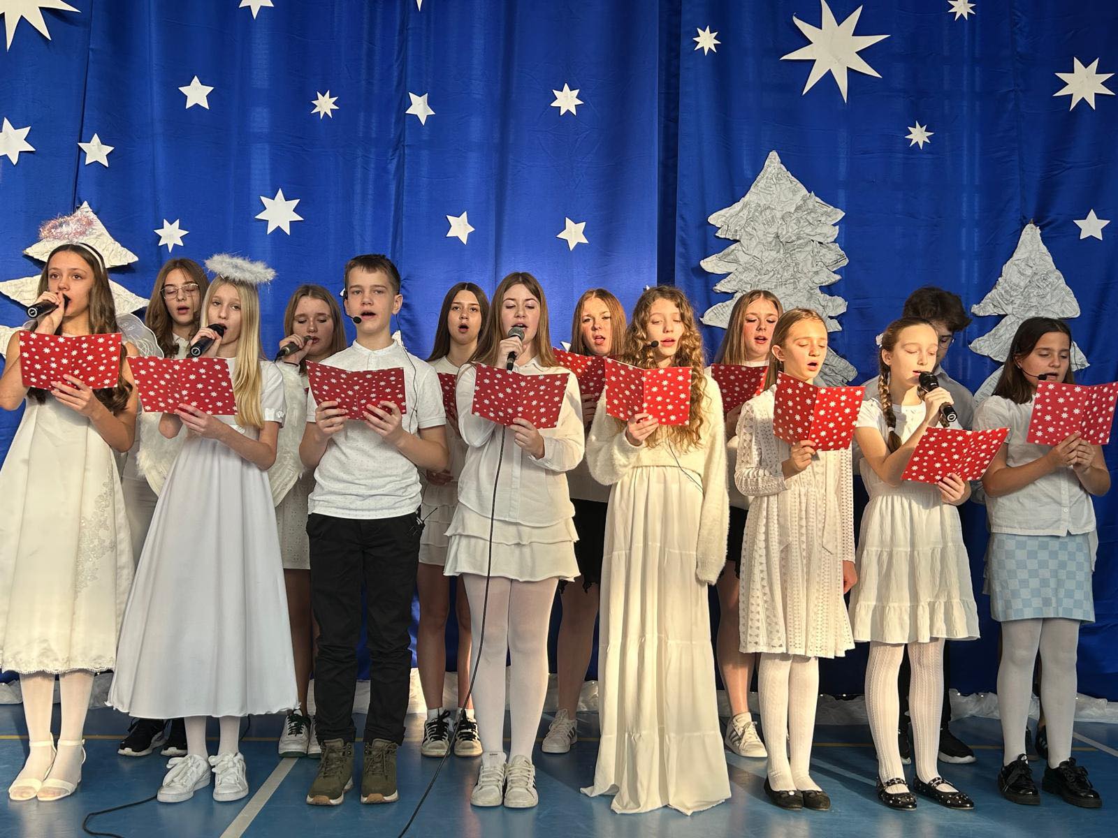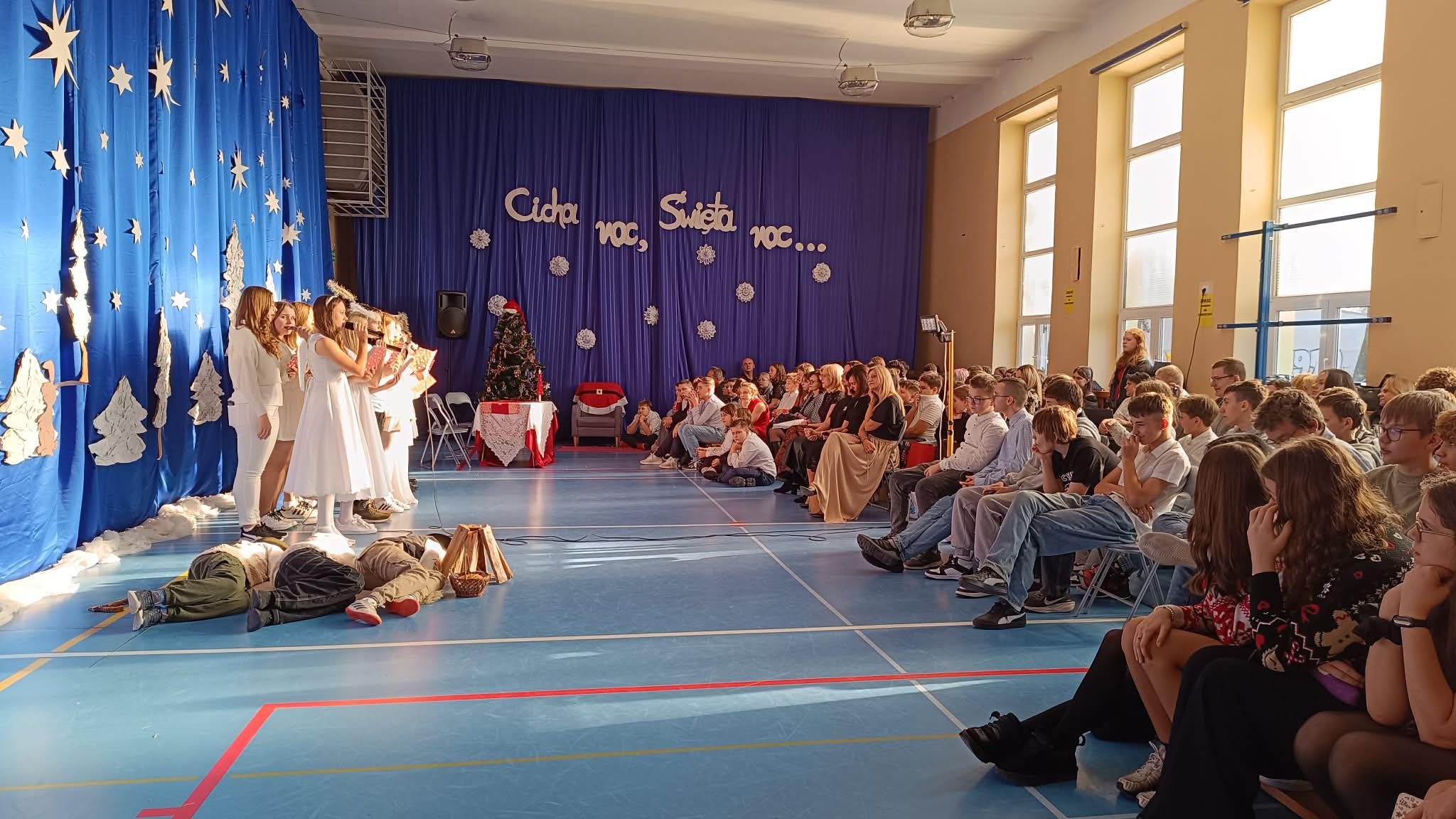 Inscenizacja wzbogacona została wyjątkową scenografią podkreślającą świąteczną atmosferę. W radosny klimat zbliżającej się uroczystości wprowadziły nas także przepiękne kolędy w wykonaniu chóru szkolnego.