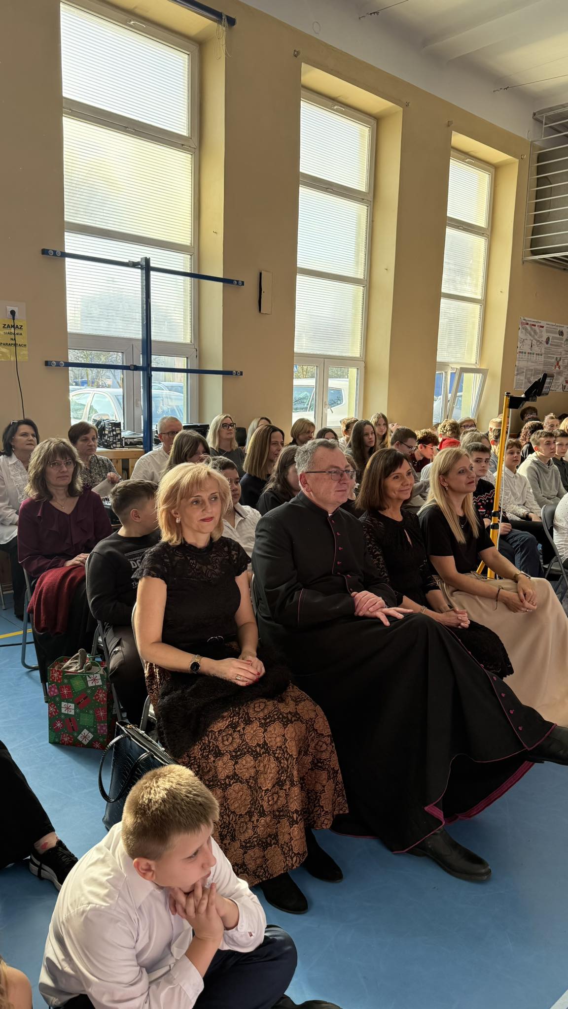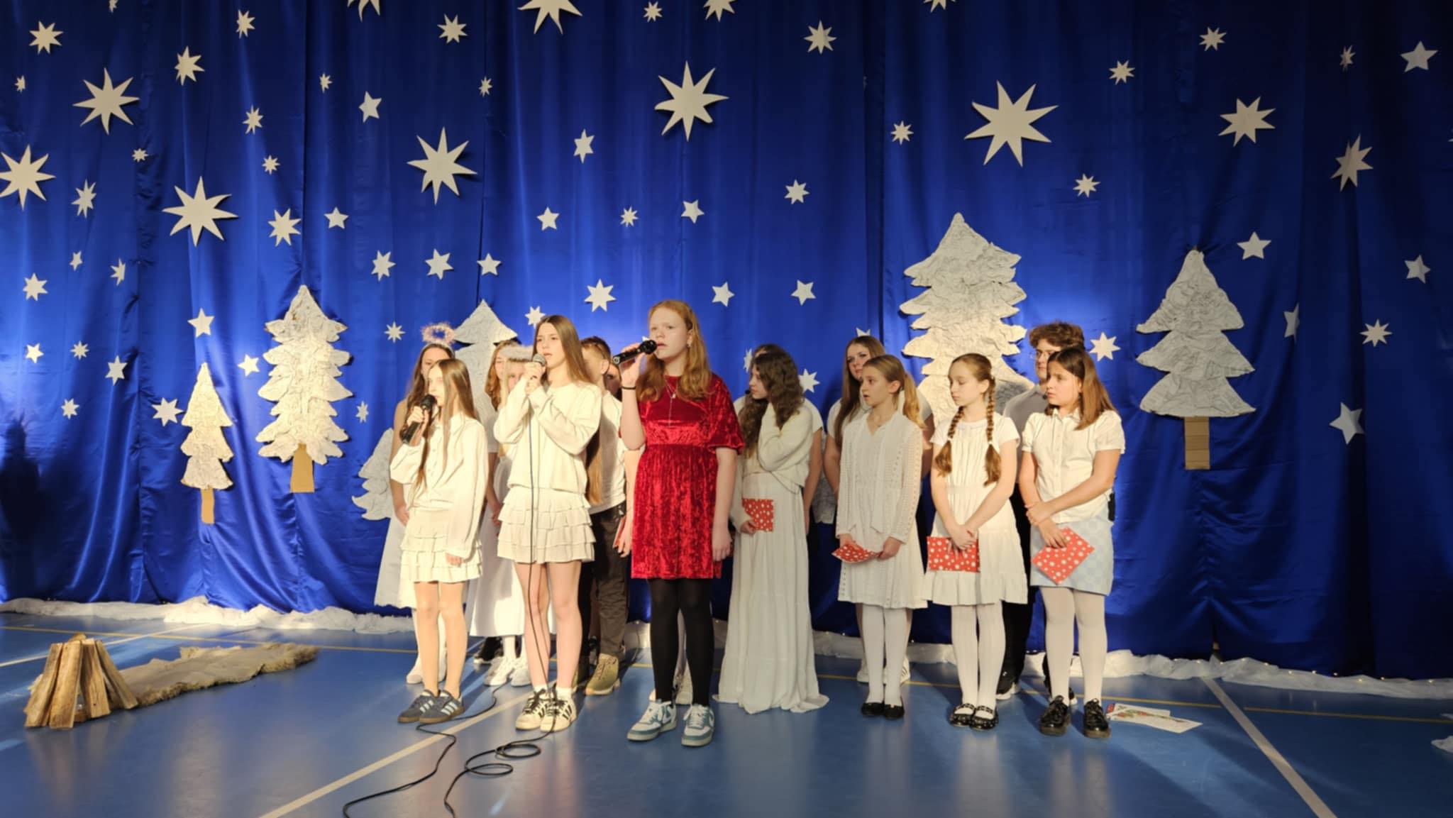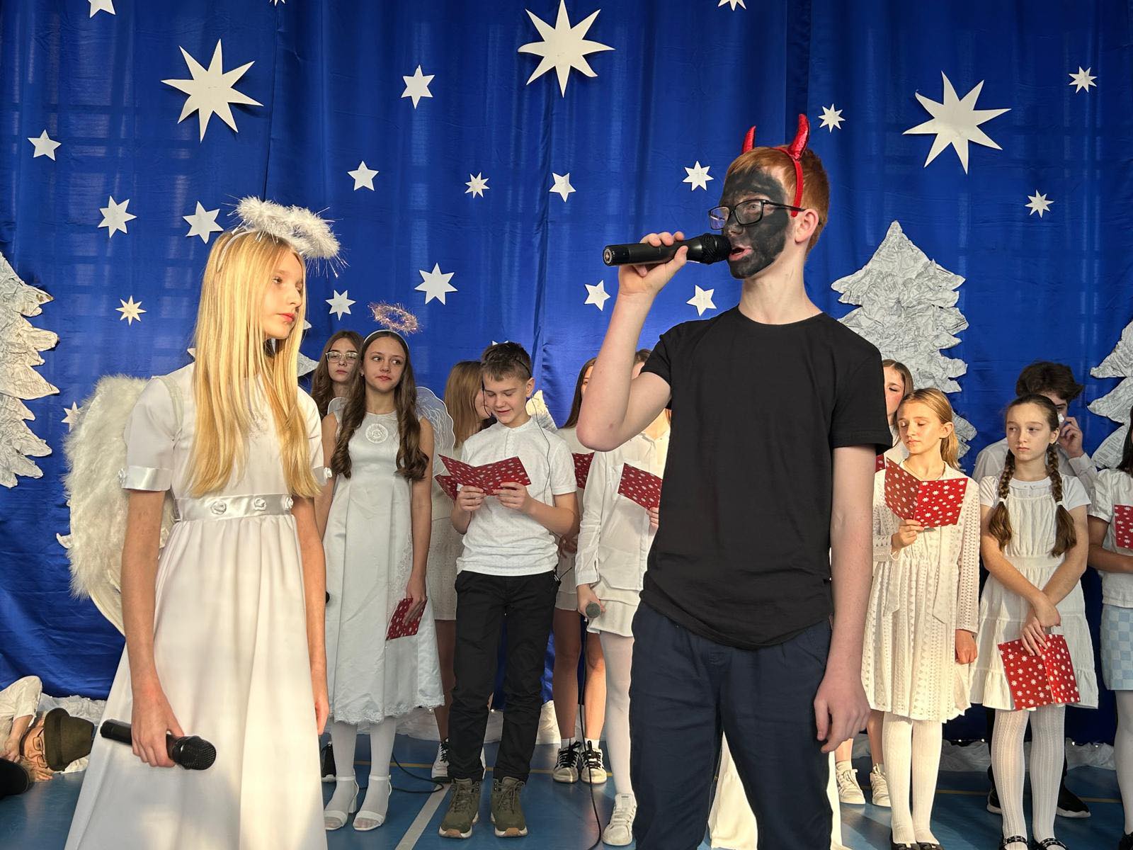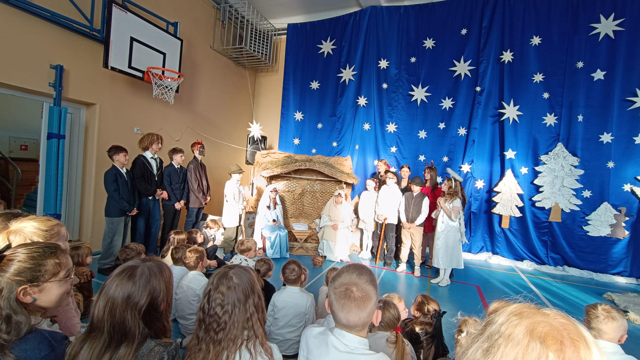 „Stajenka pełna nadziei” to tytuł przedstawienia bożonarodzeniowego w wykonaniu uczniów klasy 4a, 7a i 8c, które zostało zaprezentowane 19 grudnia. Obejrzała je cała społeczność szkolna oraz goście specjalni: pan Kamil Szymczak- Dyrektor Wydziału Kultury i Sportu oraz ksiądz Marek Wochna - proboszcz Sanktuarium św. Antoniego w Tomaszowie Mazowieckim.