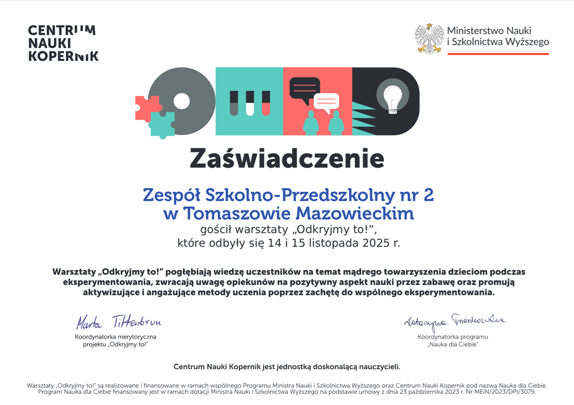 W dniach 14 i 15 listopada w naszej szkole odbyły się warsztaty dla opiekunów, edukatorów i innych osób pracujących lub spędzających czas z dziećmi „Odkryjmy to!”. Zajęcia odbyły się w ramach wspólnej inicjatywy Ministra Nauki i Szkolnictwa Wyższego oraz Centrum Nauki Kopernik.